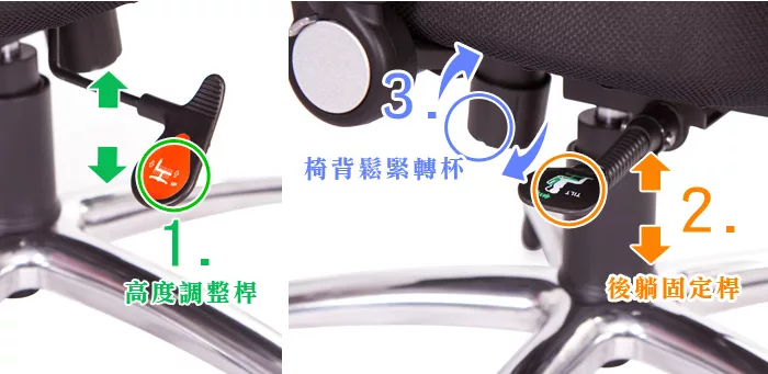 1.座椅高度..調整高度時,人請先離開座墊,在將拉桿拉起,即可將座墊昇起,若需調降高度,人則需坐在座墊上,在將拉桿拉起,透過身體重量,座面高度即可下降。