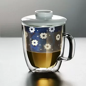 像這次特別換個~九土 雙層隔熱玲瓏釉花玻璃茶杯藍底白花