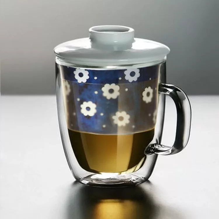 九土 雙層隔熱玲瓏釉花玻璃茶杯藍底白花