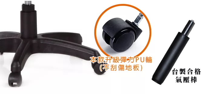 ?電腦椅透過『氣壓棒』來調整坐墊升降功能,調至個人最舒適座面高度,且台灣生產的氣壓棒,通過合格安全認證,品質良好、耐用,不會有氣爆、爆炸的問題。